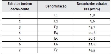 O passo inicial para a construção do modelo de Kamakura e Mazzon (2013a) consistiu na divisão da sociedade brasileira em 20 percentis, cada um representando 5% da população de domicílios, ordenados de modo decrescente no nível socioeconômico. Essa divisão em 20 partes iguais e monotonicamente decrescentes permitiria deslocar o foco estéril da discussão do quanto representa (tamanho) cada classe, para um propósito útil de possibilitar a análise da evolução do perfil de cada vintil nos indicadores de renda, escolaridade, utilização de serviços públicos essenciais, posse e quantidade de bens de conforto doméstico que caracterizam, em seu conjunto, o construto de renda permanente. Em seguida, Kamakura e Mazzon (2013a) analisaram diferenças no perfil demográfico dos vintis definidos pelo modelo de classes latentes ordinais e, como forma de validação do critério, no perfil de consumo de 21 categorias de bens e serviços da pesquisa de orçamentos familiares (POF) (IBGE, 2009), cujo consumo marginal foi ajustado pelas covariáveis composição familiar e localização do domicílio. Como segmentar o mercado em 20 partes não seria eficiente sob uma perspectiva gerencial, os vintis foram agrupados em um número menor de estratos. Para tanto, utilizaram a técnica Delphi, em que um grupo de experts avaliou o perfil de consumo de cada categoria de produto ou serviço. Da análise das diferenças estatísticas existentes nos níveis de consumo das 21 categorias, decidiram pela agregação dos vintis em sete estratos socioeconômicos, cujos tamanhos estimados pelo modelo de classes latentes encontram-se na Tabela 3, em que os estratos 1 e 2 correspondem aos respectivos vintis 1 e 2; o estrato 3 corresponde aos vintis 3, 4 e 5, e assim sucessivamente até o estrato 7, que corresponde aos vintis 18, 19 e 20.