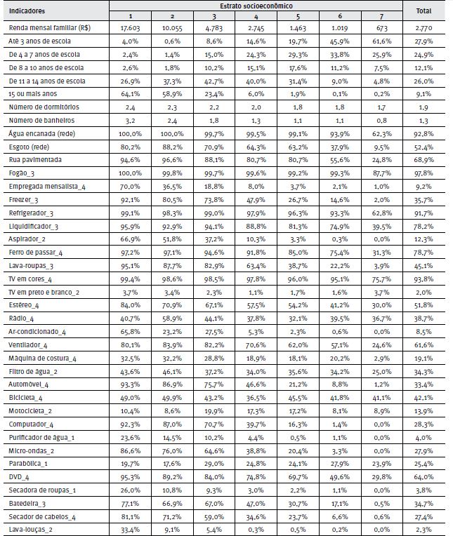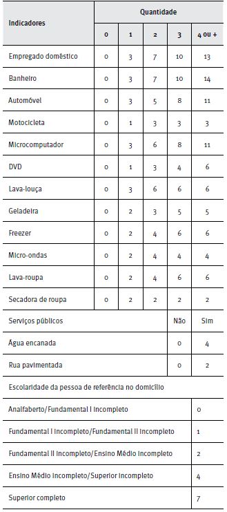 Em 1997, as entidades Associação Brasileira de Anunciantes (ABA), Associação Brasileira de Anunciantes/Associação Brasileira dos Institutos de Mercado (Abipeme) e Associação Nacional de Empresas de Pesquisa de Mercado (ANEP) desenvolveram um estudo que resultou na proposição de um critério denominado Critério de Classificação Econômica Brasil (CCEB) (ABEP, 2011). A elaboração desse critério objetivou disponibilizar um sistema de pontuação proxy da capacidade de consumo de um domicílio localizado em regiões metropolitanas brasileiras, utilizando dados objetivos e de fácil coleta no campo. Em 2008, o Critério Brasil utilizava a metodologia da regressão estatística do logaritmo da renda corrente familiar declarada como função da quantidade possuída de itens de conforto doméstico e instrução do responsável pelo domicílio (ABEP, 2011). Esse critério, aqui denominado ABEP antigo, vigorou até dezembro de 2014, conforme tabela a seguir.