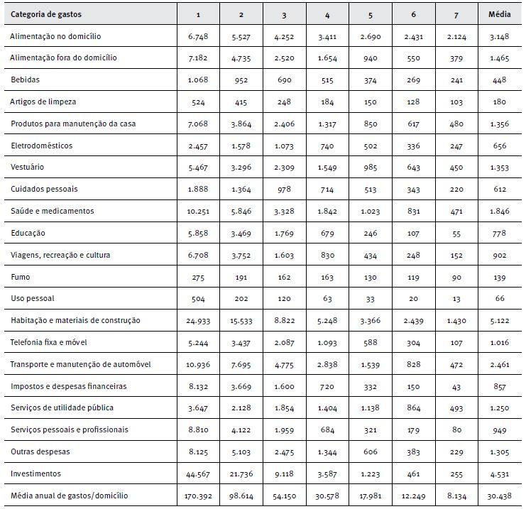 Verifica-se, pela Tabela 4, a existência de diferenças expressivas no perfil socioeconômico entre os estratos. Enquanto a renda familiar média nacional situa-se em R$ 2.770,00 (a preços de 2009), a renda média corresponde a R$ 17.603,00 para o estrato 1 - de nível socioeconômico mais elevado -, decaindo para um valor médio de R$ 673,00 para o estrato 7, o de menor nível socioeconômico. Número de banheiros no domicílio, cuja média nacional é de 1,3, no estrato 1 é de 3,2 banheiros, enquanto nos estratos 5, 6 e 7, é de um banheiro por domicílio. Tomando-se o indicador de penetração de mercado, no estrato 1, observa-se que 95,1% das moradias têm pelo menos uma máquina de lavar roupa; nos estratos 6 e 7, esse indicador corresponde a 22,2% e 3,9%, respectivamente. O processamento da base de dados da POF 2009 utilizando o classificador de verossimilhança condicional permitiu estruturar a Tabela 5, relativa a valores de consumo de bens e serviços pelos diferentes estratos. Verifica-se, pelo montante médio anual de gastos por categoria de despesa e estrato socioeconômico, que, no estrato 1, esse valor foi de R$ 170.392,00, enquanto no estrato 7 foi de R$ 8.134,00, cerca de 21 vezes mais. Selecionando uma categoria de bem essencial - alimentação no domicílio -, verifica-se que a classe 1 apresenta um gasto médio anual de R$ 6.748,00, enquanto a 7, de R$ 2.124,00 por ano. Em gastos com educação, o montante médio anual gasto pelo estrato 1 correspondeu a R$ 5.858,00, enquanto no estrato 7, a R$ 55,00. Em alimentação, a proporção de gastos do estrato 1 em relação ao 7 foi de 3,2 vezes; em gastos com educação, essa proporção foi de 106,1. No caso de "bens supérfluos", como serviços pessoais e profissionais (manicure, cabeleireiro, advogado etc.), o gasto médio anual do estrato 1 foi de R$ 8.810,00 por ano, ao passo que no estrato 7 representou R$ 80,00, cerca de 110 vezes mais. Observa-se que, nas categorias de bens mais essenciais, a proporção de gastos dos estratos de nível socioeconômico mais elevado em relação aos de nível mais baixo é bastante inferior à de categorias de bens e serviços menos essenciais ou mais supérfluos. Vale dizer que, para um bem essencial, o consumo médio tende a ser menos diferenciado do que em relação a um bem supérfluo. Não obstante, mesmo para bens essenciais, a estratificação permite evidenciar diferenças significativas na quantidade consumida e na qualidade dos bens e marcas adquiridos.