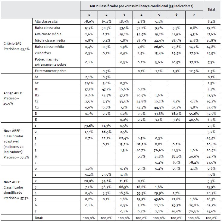 Para comparar as classificações obtidas pelos classificadores e critérios, utilizamos uma tabulação cruzada dos estratos socioeconômicos, calculando-se como métrica de precisão a média das máximas percentagens obtidas em cada um dos sete estratos definidos pelo classificador base (% indicada em cada classificador na primeira coluna da Tabela 8, calculada pela média ponderada dos números em negrito indicados nessa tabela).