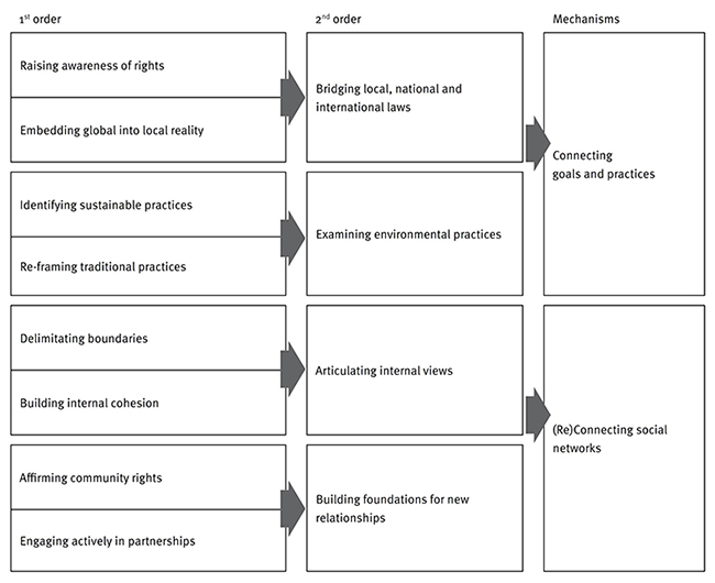 In the data analyzed for the three cases, the process of creating these protocols in a translation of the Nagoya Protocol at the local level enabled communities to resist exclusion in environmental governance through two main translation mechanisms (Exhibit 5): by connecting goals and practices and (re)connecting social networks. After presenting these mechanisms, I summarize the outcomes of the translation processes in the three different settings.