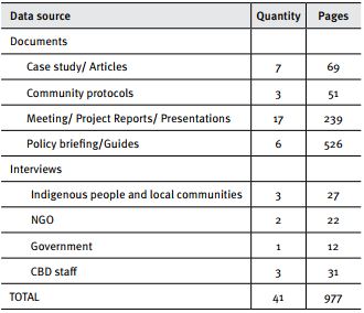 The illustrative cases are built based on information available in both these key publications (IIED, 2012; UNEP, 2013) as well as the actual community protocols created by the communities, in addition to pamphlets and newsletters. Although the secondary data used to describe the illustrative cases is very rich, a common shortcoming in this type of data is that the information made available may be influenced by the role and interests of the actors producing the material (e.g. the case studies were written in co-authorship between the NGOs and communities involved in the experience). To minimize this limitation, as part of a broader research program, the author conducted other six interviews with experts to understand the history and the impact of the community protocols locally and in global environmental governance discussions. Table 1 describes in detail the data sources.