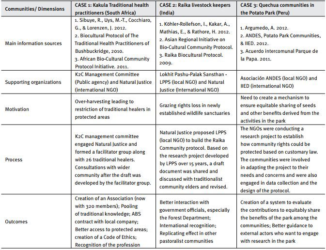 Three illustrative cases were chosen based on interviews conducted with the three staff members that work with issues related to traditional knowledge at the Convention on Biological Diversity, the international organization hosting the Nagoya Protocol. These experts have pointed to the cases appearing in The International Institute for Environment and Development (IIED, 2012) publication as interesting and relevant illustrations of the application of this specific tool in the context of ABS in different parts of the world. Moreover, these experiences are featured in another key publication produced by United Nations Environment Program (UNEP, 2013) where the CBD staff members also provided inputs and comments.
