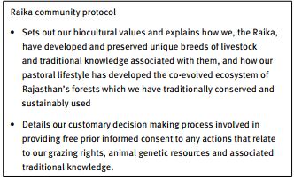 Our community should be engaged any time outside interests take decisions that may affect our livelihoods or relate to our breeds and associated traditional knowledge. For example, before any of our access rights to customary grazing areas are altered we must be consulted. Also, where researchers or commercial interests want to access our animal genetic resources and / or associated traditional knowledge, we must be given all relevant information with which to take a decision and we must be given time to discuss the issues within the community panchayat as our breed diversity and traditional knowledge are collectively held and their ownership does not vest in any single individual. (Raika Biocultural Protocol, 2009)
