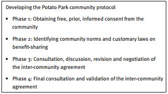 The park serves as a genetic reserve, with 700 local cultivars and 410 varieties repatriated from the International Potato Centre (IPC) in 2004. In 2011, the Potato Park adopted an inter-community agreement for equitable benefit-sharing. The community felt the need to create a mechanism to ensure equitable sharing of seeds and other benefits derived from this agreement and from other economic activities in the park (e.g. tourism, handicrafts, gastronomy, agriculture, natural products) in order to prevent disputes amongst the communities (Andes, Potato Park Communities, & IIED, 2012). The inter-community agreement aims at building the "foundations for equitable and sustainable local economies based on biocultural goods and services, while building communities' capacity to negotiate equitable agreements with third parties" (Andes et al., 2012). This agreement is an example of community protocol because it regulates the benefit-sharing activities among internal and external actors, but also because it is based on their customary laws (Andes et al., 2012).