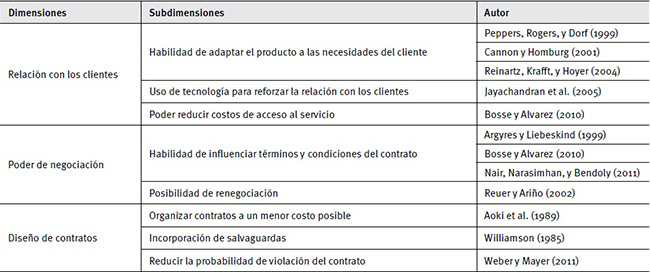 Cabe resaltar que la operacionalización de la capacidad transaccional pasa por la identificación de las dimensiones que forman parte de este constructo. En la literatura existen algunos indicios que intentan identificar las dimensiones de esta capacidad. Trabajos como los de Cannon y Homburg (2001), Langlois y Foss (1999), Loasby (2002), Argyres y Mayer (2007), Hoetker (2005) y Mayer y Salomon (2006) son importantes contribuciones en esa dirección. Sin embargo, estas dimensiones son aún diferentes y dispersas, dependiendo de cada trabajo; lo cual limita avanzar en la operacionalización de este constructo. En un reciente estudio, Zawislak, Fracasso, y Tello-Gamarra (2013) analizan diferentes sectores de la industria brasileña y proponen tres dimensiones de este constructo; estas son: relación con el cliente, poder de negociación y diseño de contratos. En el presente artículo se utilizarán las mismas dimensiones. Además, en la literatura, se ha identificado que la mayor parte de los estudios sobre la capacidad transaccional se enfocan en firmas manufactureras; descuidándose un importante sector de la economía, el sector de servicios. En ese contexto, este trabajo contribuirá a ampliar el conocimiento sobre esta capacidad en el sector servicios, más específicamente, servicios financieros a la luz de sus tres dimensiones.