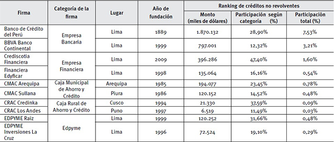 Específicamente, las firmas seleccionadas son: BCP (empresa bancaria), BBVA (empresa bancaria), Crediscotia (empresa financiera), Financiera Edyficar (empresa financiera), CMAC Arequipa (Caja municipal de ahorro y crédito), CMAC Sullana (Caja Municipal de Ahorro y Crédito), CRAC Credinka (Caja rural de ahorro y crédito), CRAC Los Andes (Caja rural de ahorro y crédito), EDPYME Raíz y EDPYME Inversiones La Cruz (Empresa de desarrollo de pequeñas y medianas empresas).