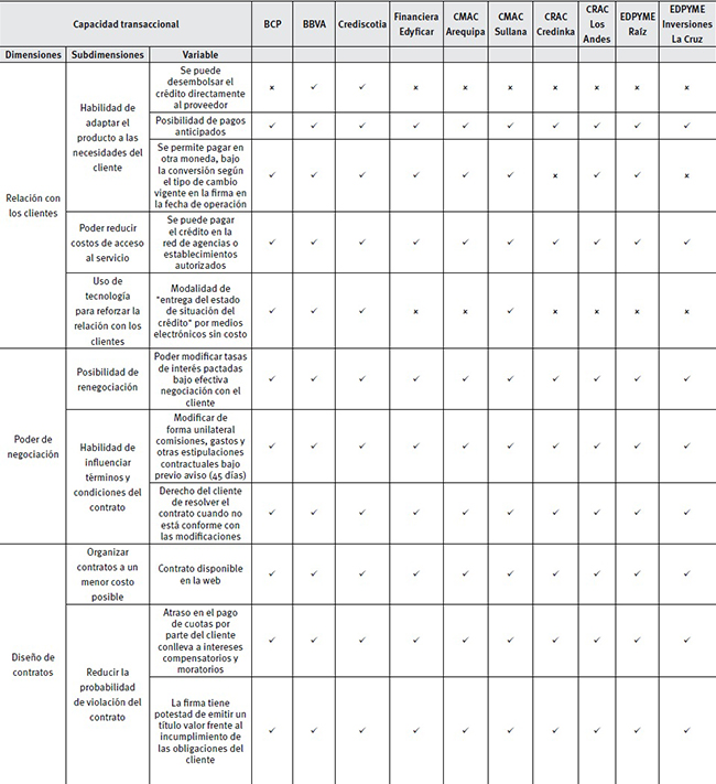 En el análisis de toda la dimensión poder de negociación se observa que las cláusulas de los contratos muestran una particularidad. Si bien no existe de forma específica la negociación directa firma-cliente debido a que las tasas y comisiones son fijas, existe negociación durante el proceso de transacción (después de adquirir el préstamo y antes de terminar de pagar el principal y los intereses). Las firmas pueden, por un lado, modificar las comisiones, gastos y otras estipulaciones. Sin embargo, por otro lado, ante estos cambios, el cliente puede resolver el contrato; es decir, existe una potencial renegociación del contrato. Si la firma exige comisiones muy altas, el cliente puede resolver el contrato y eliminar los potenciales beneficios de la transacción. Por ello, se hace evidente el espacio de negociación firma-cliente dentro del constructo capacidad transaccional.