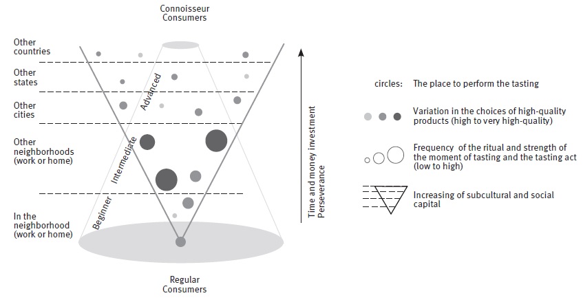To initiate connoisseurship consumption (Figure 1), the consumer must identify HEICSs near home or work and taste espresso. Engaging in the coffee connoisseurship community, improving taste, and understanding more about the specialty coffee consumption culture, they progress by exploring new HEICSs in their own city and in other cities, states, and countries. The increased subcultural and social capital and the number of HEICSs visited by coffee connoisseur consumers during their rites of passage are represented by the “V” figure. The connoisseur consumers’ stage in connoisseurship consumption is influenced by their level of engagement in the coffee connoisseurship community and their access to HEICFs to perform the taste transformation ritual. Connoisseur consumers choose some HEICSs to visit more frequently than others, as represented in the figure by the circle size. Among all HEICSs, some are considered the best and are represented by the darker circle color.