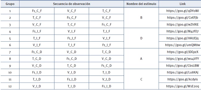 El diseño experimental es mixto y basado en diseños previos con seguimiento ocular y banners (Hernández-Méndez & Muñoz- Leiva, 2015; Muñoz-Leiva et al., 2016). Tiene un diseño intersujeto bajo las variables de sexo y disciplina, y un diseño intrasujeto mediante la posición y congruencia. Es un diseño factorial 2x2 con 12 estímulos en total divididos en tres disciplinas deportivas. Se forman cuatro grupos con tres secuencias cada uno, compuestos por diez sujetos aleatorizados y balanceado en función de la edad y el sexo del sujeto (ver Tabla 1). Pero manteniendo la asignación aleatoria de las unidades de prueba a los grupos, y los grupos al conjunto experimental congruente o no. En total, participan 120 sujetos. La Tabla 1 muestra la secuencia de observación, el nombre del grupo y el enlace de la imagen del estímulo.