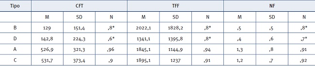 La Figura 3 muestra las diferencias en la tasa de recuerdo en función del indicador CFT, siendo esta significativa F (3,119) = 14,05, p < ,001. También existen diferencias significativas para el resto de los indicadores, TFF F (3,118) = 8,05, p < ,001, y el NF F (3,119) = 13,96, p < ,001. Estos resultados indican que las mayores tasas de recuerdo están relacionadas con mayores frecuencias en fijaciones, tiempo total de la fijación y tiempo hasta la primera fijación, estando esta última inversamente relacionada. Comparando la tasa de recuerdo empleando todos los pares según el método de Tukey-Kramer HSD obtenemos diferencias significativas entre todos los pares, excepto para el par 2-1. Lo que ciertamente ratifica tres niveles de recuerdo: 0 marcas, 1 y 2 marcas y 3 marcas.