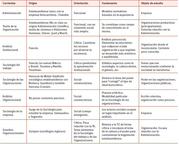 Hay muchos otros campos de conocimiento y aproximaciones teóricas que comparten aspectos propios con los EO. Entre estos se encuentran el espíritu crítico y la recurrencia a las ciencias sociales y humanas, con el objetivo de estudiar y analizar aspectos sociales en las organizaciones. Pero estos dos aspectos no son imprescindibles ni se convierten en criterio decisorio único. Hay diversas modalidades en el estudio de las organizaciones que no solo comparten estas dos características, también se diferencian en cuanto su inscripción espaciotemporal, los problemas que aborda, su ubicación paradigmática y la orientación metodológica. En la Tabla 1 se resumen las diversas modalidades a partir de la propuesta de Rendón y Montaño (2004).