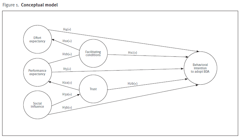 As reported previously, social influence is a good predictor of technology behavioral intention and usage (Venkatesh et al., 2003). In this work, social influence denotes the extent to which SCM professionals believe their colleagues should use Big Data. Previous studies highlight social influence as a predictor of behavioral intention (Batara, Nurmandi, Warsito, & Pribadi, 2017; Oliveira, Faria, Thomas, & Popovič, 2014; Venkatesh et al., 2012). Our study argues that in the SCM context, social influence relationships exert significant influence on trust (A. Chin, Wafa, & Ooi, 2009) and, in turn, on the behavioral intention (Alalwan et al., 2017). Thus, we propose the following hypotheses: