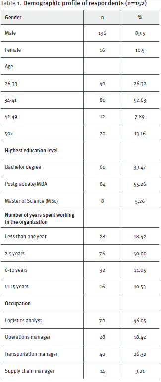 Table 1 reports the characteristics of the respondents. Male respondents comprised almost 90% of the total. Regarding age distribution, most respondents (52.63%) were aged 34-41 years. A total of 55.26% respondents had a postgraduate/MBA-the highest education level in our sample-followed by 39.47% holding bachelor degrees and 5.26% holding a master of science degree. Considering the experience at their respective organizations, 50% respondents had worked there for 2-5 years, followed by 21.05% having worked for 6-10 years and 18.42% working for less than one year. Finally, 46.05% of the sample comprised logistics analysts, followed by 26.32% transportation managers, 18.42% operations managers, and 9.21% supply chain managers.