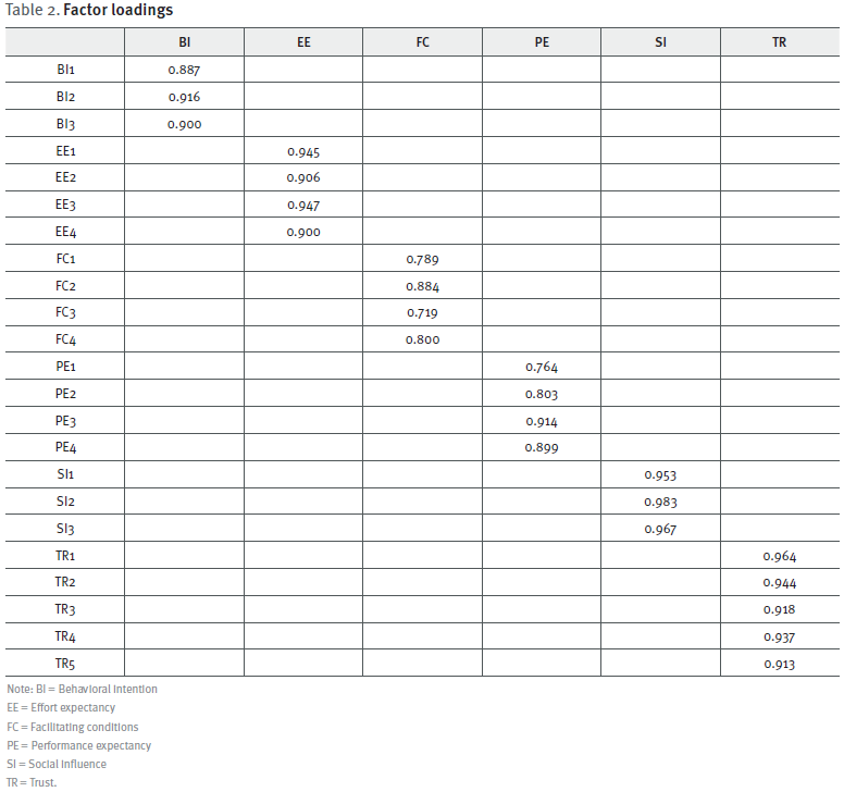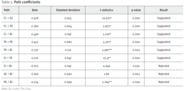 Table 5 and 6 present the results of our structural model. Table 5 highlights the path coefficients statistics.The findings indicated that FC has a significant positive effect on EE (β = 0.578, p < 0.001). Thus, H1a is supported. H1b hypothesized that FC has a significant positive effect on PE. The results (β = 0.380, p < 0.001) support H1b. H1c theorized that FC has a significant positive effect on BI. This hypothesis was also supported (β = 0.490, p < 0.001). Next, H2a argued that TR has a significant positive effect on PE. Our results (β = 0.413, p < 0.001) support this hypothesis. Then, H2b argued that TR has a significant positive effect on BI. The results supported H2b (β = 0.327, p < 0.05). H3a theorized that SI has a significant positive effect on TR. The results supported H3a (β = 0.710, p < 0.001). The rest of the hypotheses had unexpected results. H3b theorized that SI has a significant positive effect on BI. Surprisingly, the relationship was found to be negative and non-significant. Therefore, H3b was not supported (β = -0.073, p = 0.519). H4 argued that EE has a significant positive effect on BI. This hypothesis was not supported either (β = 0.166, p < 0.1). Next, H5 theorized that PE has a significant positive effect on BI. Surprisingly, the results (β = -0.214, p < 0.05) showed a negative significant effect on BI. Thus, H5 was not supported.Table 6 demonstrates the variance of the model: 46% variance in BI; 33.30% in EE; 49.80% in PE; and finally, 50.30% in TR. In line with the literature (W. W. Chin, 1998), all r-squares of the model exceeded the 0.20 threshold (Martins et al., 2014).