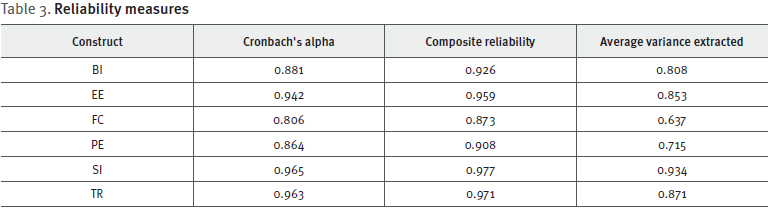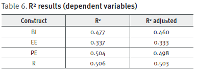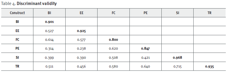 All outer loadings highlighted in Table 2 exceeded the 0.70 threshold recommended in the literature (Hair et al., 2017). Table 3 shows the main measures for construct reliability and internal consistency of items. In this study, both Cronbach's alpha value and composite reliability were above the 0.70 threshold, and all average variance extracted values were above the 0.50 threshold (Hair et al., 2017; Nunnally, 1978; Riffai, Grant, & Edgar, 2012). Therefore, all constructs in the model have their utilization validated. Table 4 presents the discriminant validity results. In this case, the square root of the average variance extracted for each construct should be greater than the correlations between the constructs (Fornell & Larcker, 1981; Henseler, Ringle, & Sinkovics, 2009). Our results are higher than the 0.70 threshold (Fornell & Larcker, 1981), confirming that all constructs show discrimination (Ahmad & Khalid, 2017; Martins, Oliveira, & Popovič, 2014).