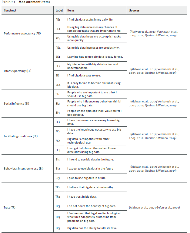Despite the potential benefits of employing big data in supply chain management (Hazen, Boone, Ezell, & Jones-Farmer, 2014; Kache & Seuring, 2017; Schoenherr & Speier-Pero, 2015), awareness of and initiatives on big data in the Brazilian SCM context are rare, and the literature lacks strong empirical results (Queiroz & Telles, 2018). The current initial stage of big data adoption presents an opportunity for scholars and practitioners to fill this gap. For example, to the best of our knowledge, no previous study analyzed the intention of Brazilian SCM professionals to adopt big data. To bridge this gap, this study provides an in-depth understanding of Brazilian supply chain professionals' intention to use big data. We adapt a previously developed and validated unified theory of acceptance and use of technology (UTAUT) model (Venkatesh, Morris, Davis, & Davis, 2003; Queiroz & Wamba, 2019), by including a trust construct. More specifically, this study answers the following research question: How do the variables from the UTAUT model explain Brazilian SCM professionals' intention to adopt big data?