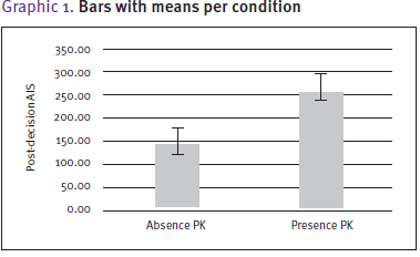 An independent sample t-test was conducted. Individuals assigned to the "presence of previous knowledge" group (M = 253.907 seconds, SD = 107.108 seconds) spent more time searching for information than individuals assigned to the "absence of previous knowledge" group (M = 140.106 seconds, SD = 235.200), with t(68) = 2.579, p < .05, and d = .62 (see Graphic 1). A complementary ANCOVA showed that the effect was resilient when controlling for the participants’ experience with the game. The item in which the participants reported their experience with the options available was nonsignificant, with F (1, 66) = .326, n.s, as well as the item in which they reported their experience with the chosen game, with F (1, 66) = .013, n.s. An ANCOVA also showed that involvement did not exert any effect, with F (1, 67) = .013, n.s.