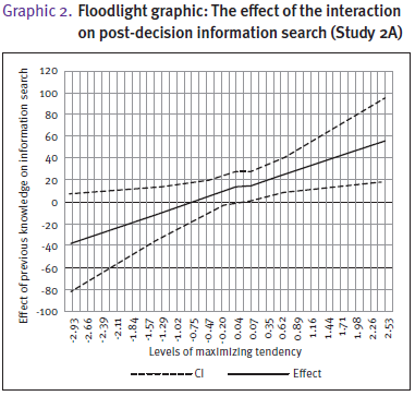 To estimate the effects of previous knowledge according to the maximizing tendencies values, we used the Johnson-Neyman technique to conduct a floodlight analysis (Spiller et al., 2013). We used model 1-PROCESS (Hayes, 2013) for this procedure. The results suggest that previous knowledge did not affect post-decision information search at the lowest levels of maximization. For maximization levels closer to the sample mean (maximizing tendencies > .039, mean-centered), the effects of previous knowledge were significant and positive, increasing in size as a function of maximizing tendencies. That is, the positive effects of previous knowledge tend to increase with the maximization tendencies (see Graphic 2).