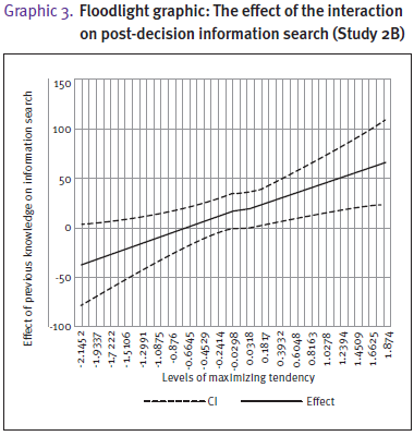 A floodlight analysis using the Johnson -Neyman technique (Spiller et al., 2013) revealed that, for high levels of maximization (maximizing tendencies >.032, mean centered), the effects of previous knowledge were positive and increased as a function of the maximizing tendencies (see Graphic 3). This is in tune with the results from Study 2A. Conversely, the negative effects of previous knowledge on post-decision information search achieved moderate levels of significance at the lowest levels of maximization (maximizing tendencies < -1.934, mean centered).