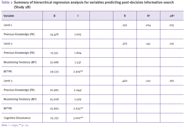 A correlation analysis tested the relationship between satisfaction and post-decision information search (r = .068, n.s). The same procedure used in Study 2A was conducted to investigate the effect of previous knowledge, maximizing tendency, their interaction and cognitive dissonance on post-decision information search. Table 2 reports the results from the hierarchical multiple regression analysis.