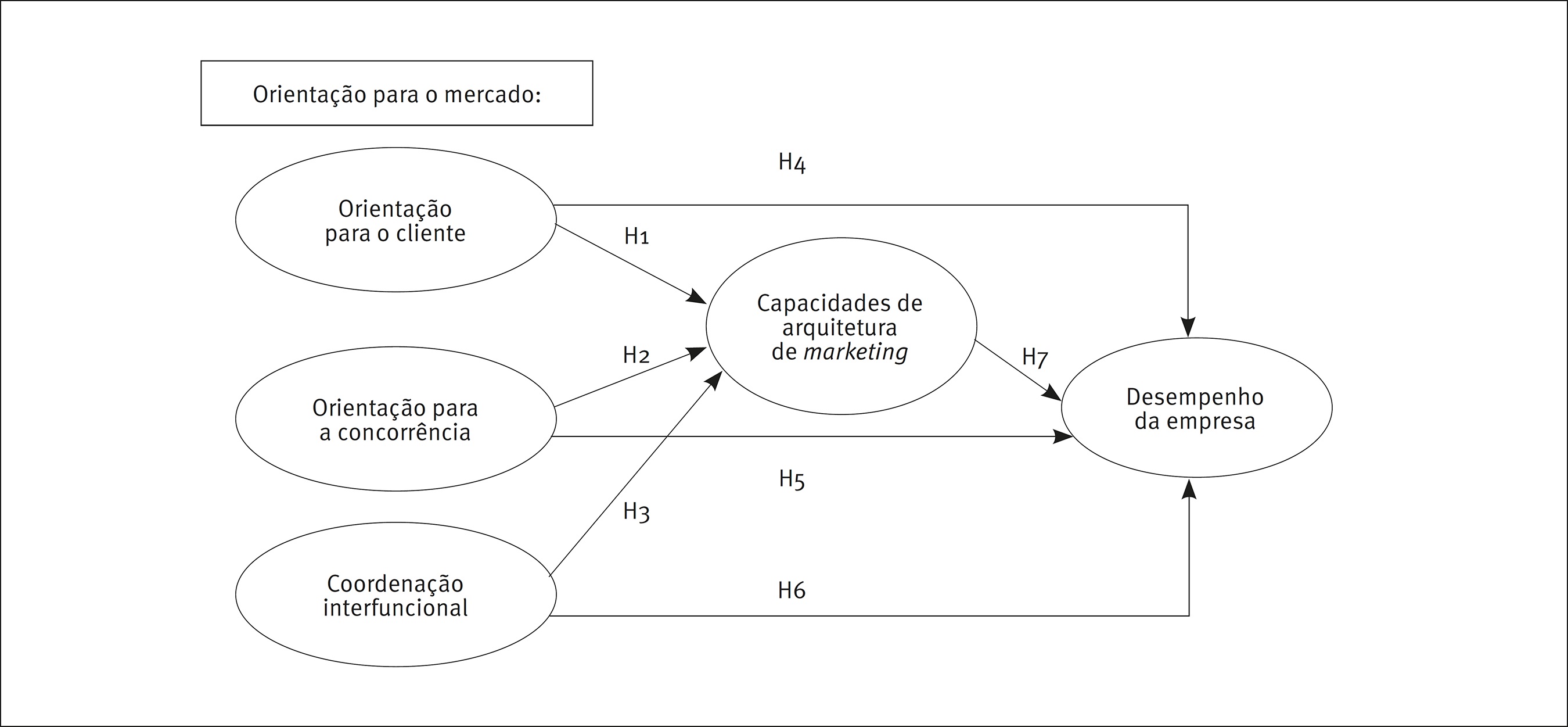 O desenvolvimento das capacidades de arquitetura de marketing é um processo que inclui o planejamento e a implementação de estratégias de marketing (Morgan, 2012). O marketing precisa ser planejado para definir metas de mercado e desenvolver estratégias de marketing eficazes, ao passo que a implementação de um processo de marketing é necessária para facilitar a alocação de recursos de marketing, interpretar as estratégias de marketing de maneira adequada e introduzir programas de marketing de modo eficaz (Vorhies & Morgan, 2005). Poucas pesquisas têm sido realizadas sobre o efeito da orientação para o mercado nas capacidades de arquitetura de marketing. Às vezes, a orientação para o mercado e as capacidades de arquitetura de marketing são tratadas como variáveis independentes que afetam o desempenho da empresa (Morgan, Slotegraaf, & Vorhies, 2009). Da mesma forma, a compreensão da relação entre o desempenho da empresa e a orientação para o mercado será mais completa se os objetivos forem compreendidos, de modo que o papel do mediador determinará a força da relação (Han, Kim, Han, Kim, & Srivastava, 1998).