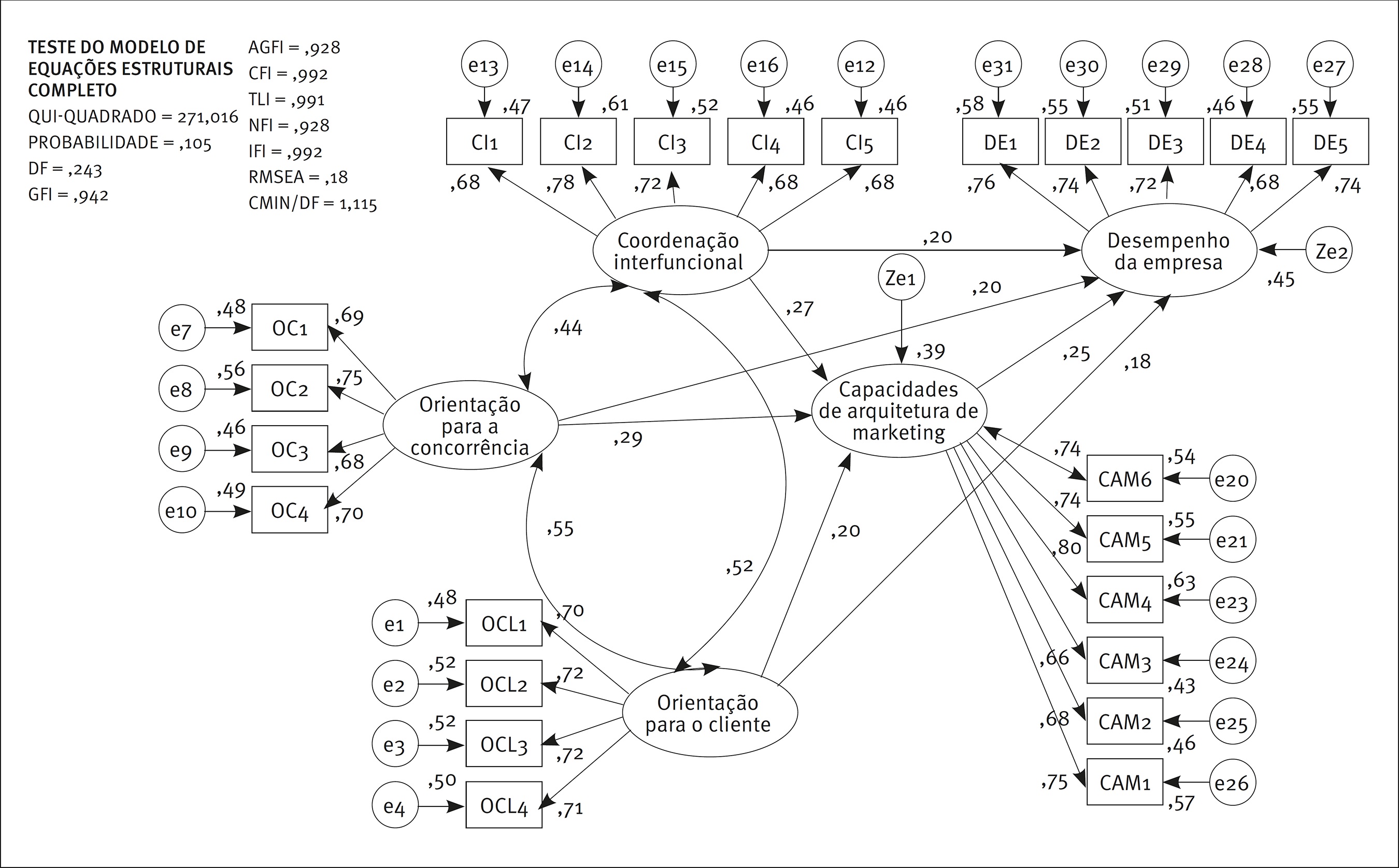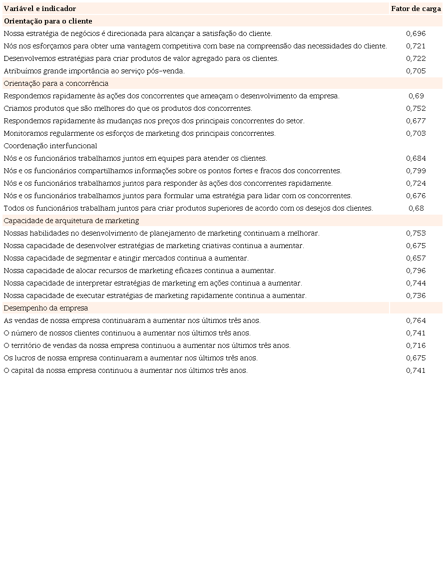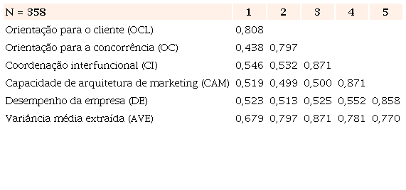 A Tabela 1 mostra que todos os indicadores são válidos, o que se comprova pelo valor do fator de carga, > 0,5 e p < 0,05. A Tabela 2 mostra que todos os indicadores das variáveis latentes medidas apresentam consistência interna, ou seja, todos os construtos são confiáveis (Hair et al., 2010). Os valores de confiabilidade composta (CR) > 0,6 e variância extraída (VE) > 0,5 estão de acordo com os padrões de consistência interna para os indicadores medidos. As variáveis de orientação para o cliente, orientação para a concorrência, coordenação interfuncional, capacidades de arquitetura de marketing e desempenho da empresa apresentam valores de CR> 0,7 e AVE> 0,5.
