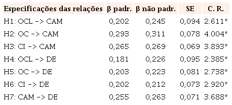 A Figura 1 e a Tabela 3 mostram que existe uma relação significativa entre OCL e CAM (β padr. = 0,202, CR = 2.611, p <0,01), portanto a hipótese H1 é aceita. Além disso, há uma relação significativa entre OC e CAM (β padr. = 0,293, CR = 4.004, p <0,01), CI e CAM (β padr. = 0,265, CR = 3.893, p <0,01), portanto H2 e H3 são aceitas. Há uma relação significativa entre OCL e DE (β padr. = 0,181, CR = 2.385, p <0,01), OC e DE (β padr. = .203, CR = 2.738, p <0,01), CI e DE (β padr. = 0,202, CR = 2,90, p <0,01), portanto H4, H5, H6 são aceitas. Também há uma relação significativa entre CAM e DE (β padr. = 0,255, CR = 3.688, p <0,01), o que significa que H7 é aceita.Como variável interveniente, CAM atende aos critérios de que CI, OC e OCL têm um efeito significativo sobre DE, e também que CI, OC e OCL têm um efeito significativo sobre CAM, então CI, OC e OCL têm um efeito significativo sobre DE, controlando CI, OC e OCL (Baron & Kenny, 1986). Os resultados deste estudo mostram que há uma influência significativa e decrescente de CI, OC e OCL sobre DE quando a variável CAM é incluída, portanto há mediação parcial.