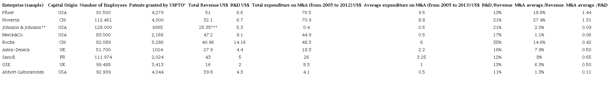 To present the sample and show its relevance in the pharmaceutical industry, we compared financial and effort data (the share of R&D over Revenues), such as: revenues, R&D, and the relationship between revenue and R&D. We also compared M&A expenditure with these variables and reported it all in Table 1 (all values in the table refer to 2012, with the exception of patent count).