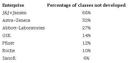 The Y axis shows the number of new classes developed. A new class is considered when a patent is first granted to the large enterprise in a patent subclass. The X axis indicates the years. For example, in 1994, GSK started to patent in five new classes.