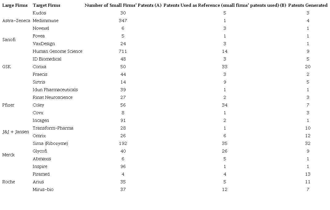 By further developing our analyses and focusing on patent citations based on (Hall et al., 2001; Henderson, Jaffe, & Trajtenberg, 1998; Trajtenberg et al., 1997) we can state that the most cited patents are the most important for the firm. A high citation level indicates a promising invention. By extrapolating, the small firms that had the most patents cited by the acquiring firm are also the most important targets. Therefore, Table 3 also indicates the most important small firms in terms of single technologies. For instance, cases like Arius, Piramed, and Transform-Pharma show the firms whose patents were most frequently cited. Thus, their knowledge base is valuable for the acquiring firm. We report these cases in the last column of Table 3, in which we show the patents generated through small firms’ patents.
