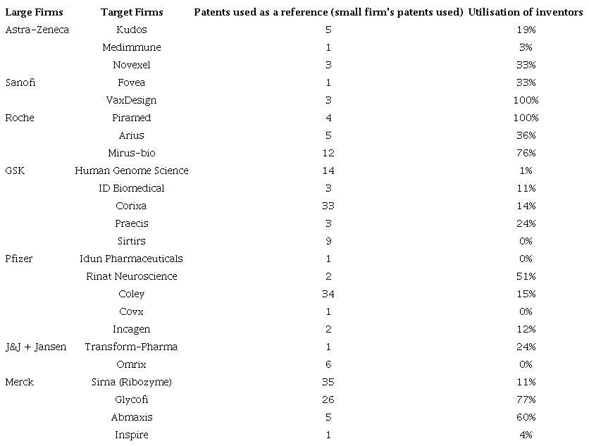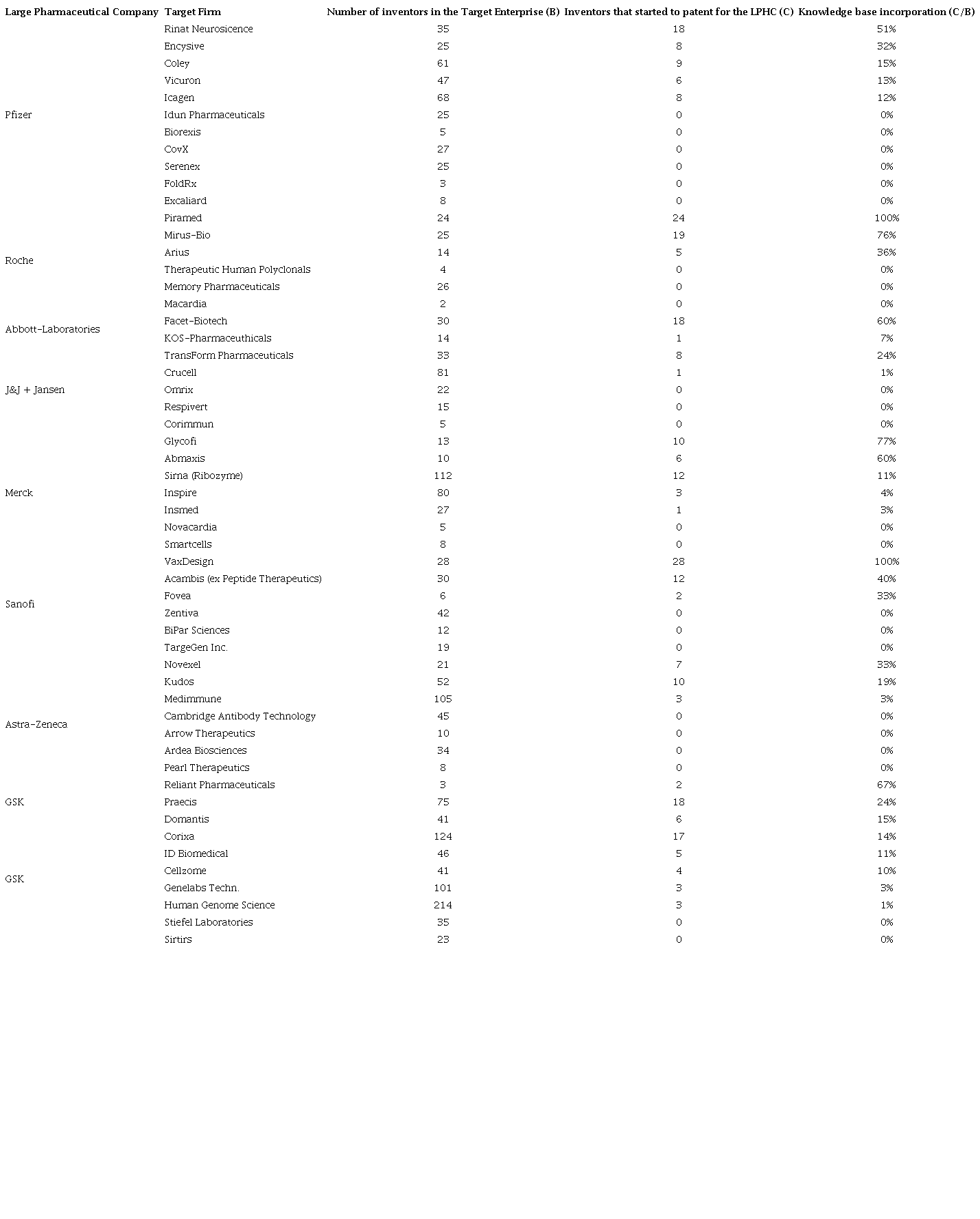 This study is based on acquisitions from 2005 to 2012 conducted by eight LPHFs: (i) Pfizer, (ii) Johnson & Johnson( We compiled patent information from Johnson & Johnson and Janssen together), (iii) Roche, (iv) Sanofi, (v) Astra-Zeneca, (vi) Abbott-Laboratories, (vii) Glaxo SmithKline (GSK), and (viii) Merck. These 8 firms acquired 51 SPHFs. Based on these 51 SPHFs’ patents we identify three ways in which the external analytical knowledge base (target enterprise’s knowledge base) had an impact. To do so we use three sources of data, two of them used to select the sample and one to compile the firms’ analytical knowledge base.