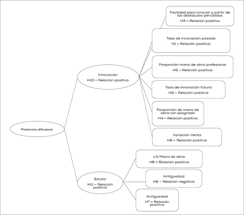 Potencia difusora (difusora). Que representa la capacidad de las empresas “proveedoras especializadas” y “basadas en ciencia” para difundir las tecnologías 4.0 en el resto de la economía nacional. Según nuestro modelo, la capacidad difusora dependería positivamente de la capacidad de innovar que tengan las empresas y de la escala de operación que estas presenten.