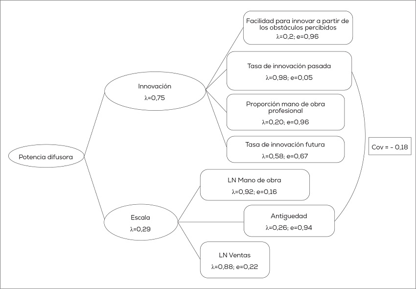 Se presenta la figura 2 que permite visualizar el primer modelo construido. En principio, las variables latentes innovación y escala de operación son explicativas de la “potencia difusora” (Tabla 4). A partir de las cargas factoriales estandarizadas (en adelante, λ), la capacidad innovadora (λ= 0.75) presenta una mayor injerencia que la escala de operación (λ= 0.29).