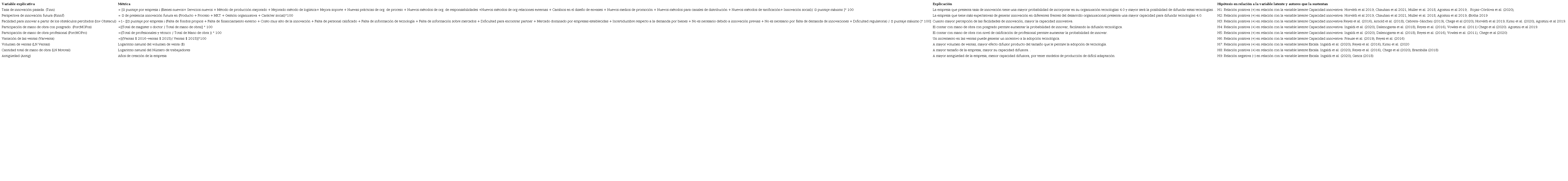 En tanto en lo Cuadro 2 se presentan con mayor nivel de detalle las variables explicativas, la métrica a partir de la información disponible en la Encuesta de Innovación, la explicación y la relación esperada en el contexto del modelo a partir de la revisión bibliográfica.