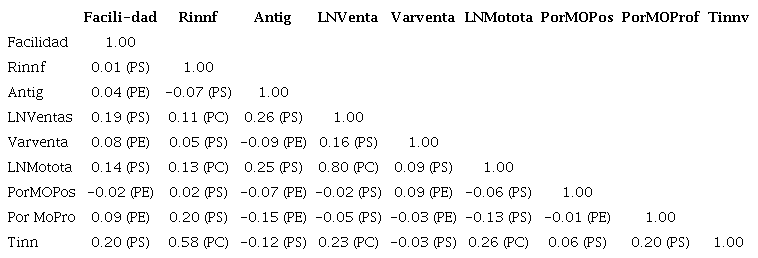 Tal como se mencionó anteriormente, la distribución que presentan las variables estudiadas no cumplen los supuestos de normalidad multivariable, por tanto se trabaja con modelos específicos para variables ordinales (Jöreskog, 1994), vale decir, se utilizó una matriz de correlación de Pearson, policórica y poliserial (Tabla 1) y se aplicó un método de estimación de mínimos cuadrados ponderados diagonales robustos (DWLS), contenido en el sistema Lisrel 8.8, especialmente diseñado para variables ordinales.