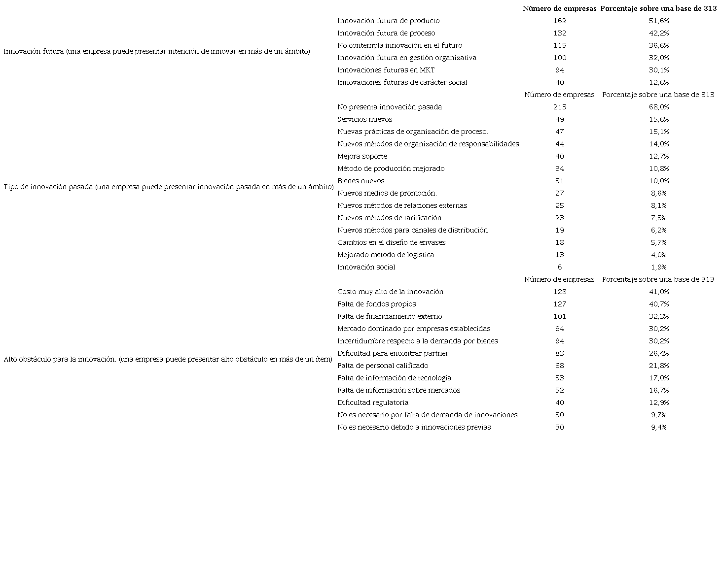 Respecto a las innovaciones en los dos años anteriores resulta interesante que el 68% de las empresas no presente alguna innovación. Si comparamos aquellas que quieren innovar en el futuro (63,3%) con las que innovaron efectivamente en los dos años anteriores (32,0%), comprobamos que hay un problema de eficiencia innovativa donde hay un alto porcentaje de empresas que tienen pretensiones de innovar pero que no llegan a concretarlo. La tasa de innovación de años anteriores (32,0%) está por sobre similar promedio nacional del 23,6% (Gatica, 2019).