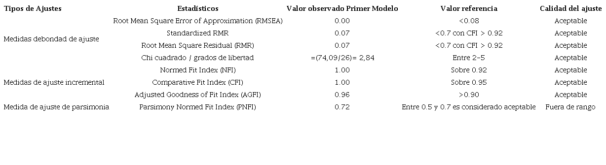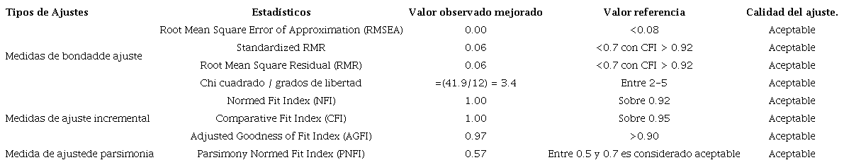 Al respecto, se presenta la Tabla 3 con los principales indicadores de bondad de ajuste, medidas de ajuste incremental y ajuste de parsimonia, comparándolos con los parámetros de referencia habitualmente utilizados en la bibliografía (Escobedo, Hernández, Estabané, & Martínez, 2016; Hair et al., 1999).