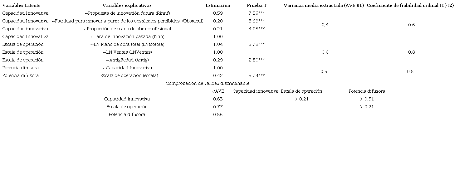 Se presenta la figura 3 para visualizar el modelo construido. Al revisar la tabla 6, vemos que en el segundo modelo el coeficiente de fiabilidad ordinal (ῳ) se mueve entre 0.6 y 0.8 para las variables latentes, ubicándose en un rango aceptable. En tanto, la varianza media extractada (AVE) para la variable “escala” es del 0.6. En el caso de la “capacidad innovativa” mejora de 0.2 a 0.4 quedando más cercano del óptimo de 0.5. En tanto, el segundo modelo tiene capacidad discriminante constando que √AVE de las variables latentes es mayor que la correlación de estas (tabla 6).