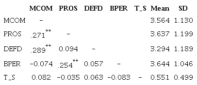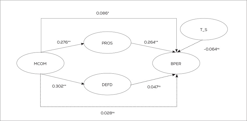 Table 2 summarizes the variables correlation matrix and descriptive statistics. The Pearson correlation was used, showing that marketing competition (MCOM) was positively correlated with defender (DEFD) (r=0.298, p=0.003) and prospector (PROS) (r=0.271, p=0.005) strategies. Business performance (BPER) was also positively correlated with PROS (r=0.254, p=0.008). However, correlation was not significant between DEFD and PROS (r=0.094, p=0.334), DEFD and BPER (r=0.057, p=0.558), and MCOM and BPER (r=-0.074, p=0.451). In addition, the dummy variable trade_service (T_S) did not present significant correlation with MCOM (r=0.082, p=0.402), PROS (r=-0.035, p=0.717), DEFD (r=-0.063, p=0.520), and BPER (r=-0.083, p=0.395).