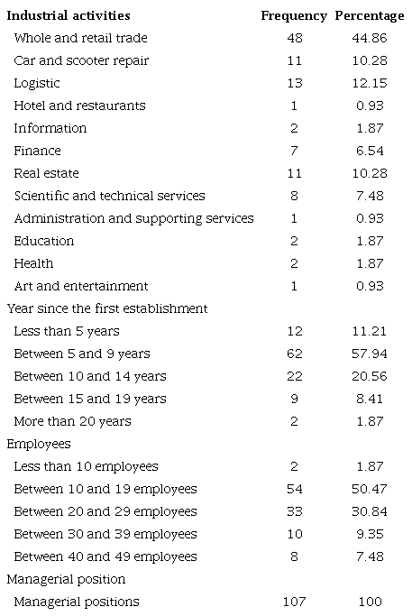 Table 1 presents the characteristics of the 107 small businesses in the sample, according to the responses offered by their owners. Almost half of them (44.86%) operated in the whole and retail trade. The industries with only one respondent (0.93%) were hotel and restaurant and art and entertainment. In the sample, 62 small businesses (57.94%) were operating in the market for 5 to 10 years, while only two small businesses (1.87%) had operated for more than 20 years. Most small businesses (50.47%) employed between 10 and 20 employees, while only two (1.87%) had less than 10 employees.