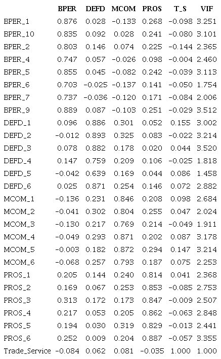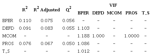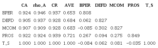 The assessment of discriminant validity was also established. Table 4 shows that the AVE’s square root was higher than any correlation between this variable and other latent variables (Chin, 1998; Fornell & Larcker, 1981). In addition, composite reliability (CR) was established since CR, Cronbach’s Alpha (CA), and Dillon-Goldstein’s rho (rho_A) were higher than the 0.70 threshold value (Table 4) (Hair et al., 2011; Henseler, Ringle, & Sinkovics, 2009). Finally, Table 3 shows that the items’ VIF values were below the threshold value of 5, which shows the absence of collinearity among items (Hair et al., 2011).