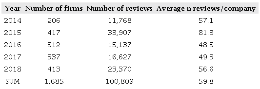 By merging Valor 1,000 and Brazil’s Glassdoor databases using a threshold of at least 15 reviews per firm-year, I ended up with a final sample of 1,685 firm-year observations for 670 different firms based on the reviews of 100,809 employees. Each firm received an average of 150.5 employee reviews over this period (59.8 reviews per firm-year on average), as detailed in Table 1.