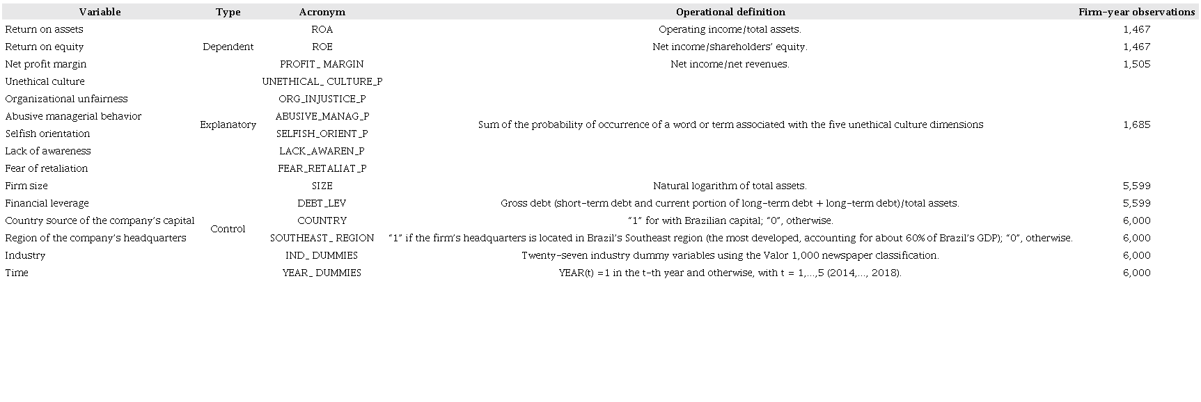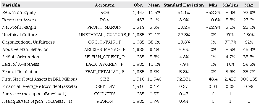 The Valor 1,000 ranking is composed of a majority of unlisted and closely held firms. As a result, public information about these companies is scarce, and it is not possible to use an ideal set of controls. In any case, I carried out my best efforts to control for the following attributes that might influence the main variables of interest: firm size (SIZE) – total assets; financial leverage (DEBT_LEV) – short-term plus long-term debt divided by total assets; country source of the company’s capital (COUNTRY) – dummy variable with “1” for firms with Brazilian capital, and “0” otherwise; location of the company’s headquarters (SOUTHEAST_ REGION) – dummy variable with “1” if the firm’s headquarters is located in Brazil’s Southeast region, and “0” otherwise; industry controls – 27 industry dummy variables based on the Valor 1,000 classification; and, time controls – yearly dummies from 2014 to 2018. All variable definitions are provided in Table 3. To reduce the influence of extreme values, I winsorized continuous variables at the 1st and 99th percentiles.