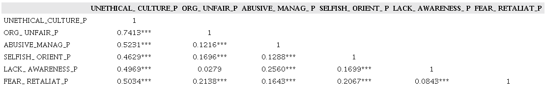 This initial inspection of the data concludes with correlations and quartile analysis. Correlations are presented in three matrices. The first shows the correlations among the five dimensions that make up an unethical culture.