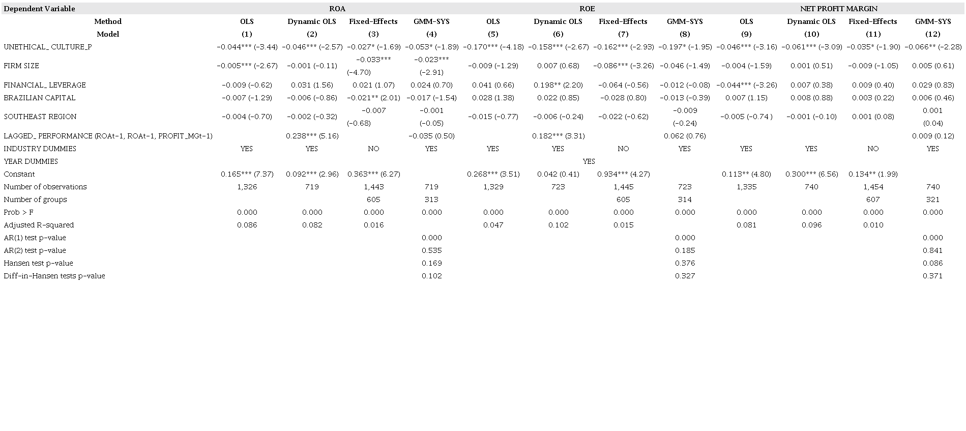 The more important results, though, come from the more robust System-GMM regressions. Here, the coefficients for unethical culture remain negative and significant for all financial performance variables. In the case of ROE, for example, the Hansen test has a p-value of 0.376, while the difference-in-Hansen test p-value is 0.327. These tests suggest that it is not possible to reject the null hypothesis that the lagged instruments are valid. The coefficient of unethical culture for ROE is also large (0.197, about four times the size of the OLS coefficient), corroborating the idea of a relevant economic impact for this performance indicator.