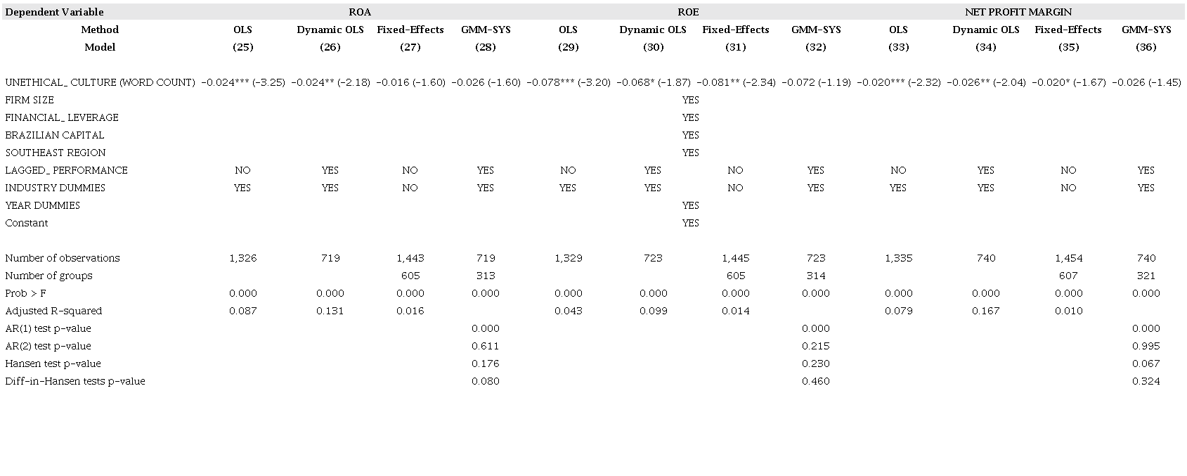 I find two main results. The first is that companies scoring higher in my unethical culture indicator are, on average, less profitable. This result holds after controlling for firm characteristics, industry, and time fixed-effects in System-GMM regressions using return on equity (ROE), return on assets (ROA), and net profit margin as alternative measures of financial performance.