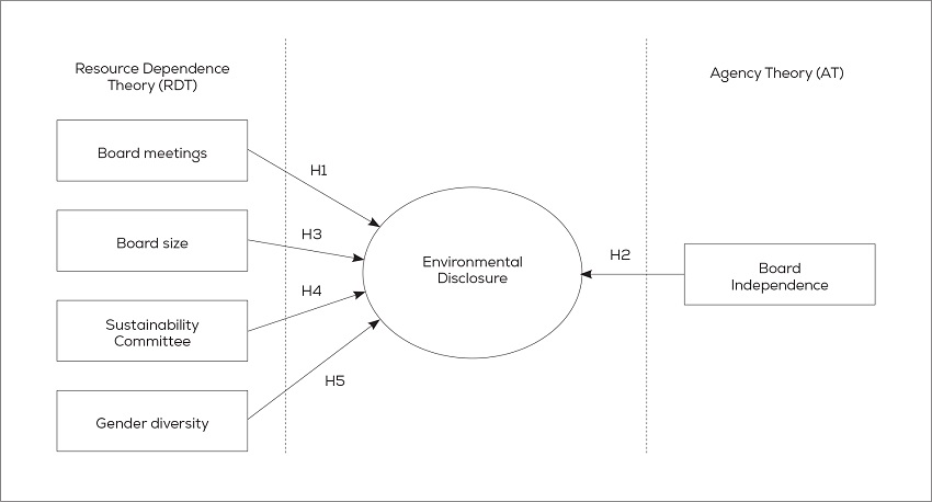 The boards of directors are a resource responsible for the proper functioning of the company since they determine the rules and functions for the executive directors, effect their hiring and dismissal, authorize the proposals of the strategic managers, determine the long-term business objectives, monitor the financial performance, and define performance policies, including corporate social responsibility actions (Schiehll et al., 2018). Therefore, the boards’ attributes, such as number of meetings, board size, presence of a sustainability committee, and gender diversity, can contribute to companies having a greater engagement in environmental disclosure.