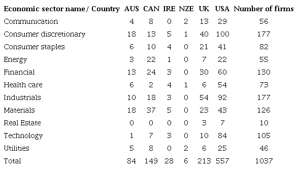 The study population comprised all publicly traded companies from Australia, Canada, Ireland, New Zealand, the United Kingdom, and the United States present in the Thomson Reuters Eikon® database. The sample consisted of 1,037 companies from with available corporate governance data. We analyzed 4 years: from 2015 to 2018. Table 1 shows the distribution of companies by sector and by country.
