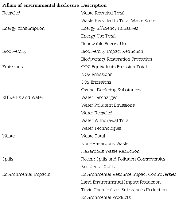 The data collection followed the methodology of Gamerschlag et al. (2011). They claim that environmental disclosure can be measured through eight pillars. Thus, Thomson Reuters Eikon® environmental indicators were grouped, resulting in the environmental index. The dependent variable of this study is environmental disclosure. This disclosure was calculated through the sum of each of the 25 indicators analyzed. If a company discloses the 25 indicators, it has a maximum performance of 25 points. In building this index, we used objective indicators, trying to avoid greenwashing. Table 2 shows how the environmental index was built.